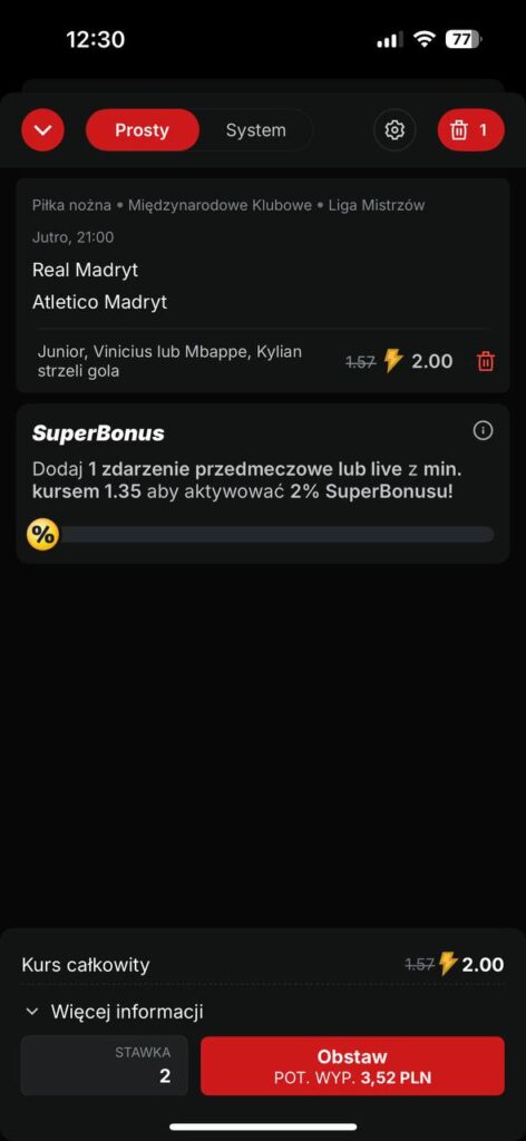 Należy wejść do oferty  meczu Realu Madryt z Atletico Madryt i obstawić Vinicius Júnior lub Kylian Mbappe strzeli gola. Nasz przygotowany kupon powinien wyglądać tak jak na zrzucie ekranu: