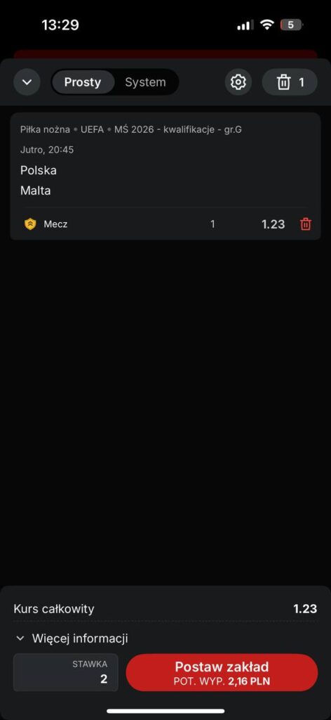 Należy wejść do oferty  meczu Polska vs Malta i postawić za 2 zł Polska wygra mecz. Nasz przygotowany kupon powinien wyglądać tak jak na zrzucie ekranu: