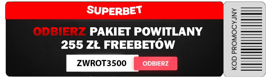 Superbet kod promocyjny to ZWROT3500. Użycie go w formularzu rejestracyjnym aktywuje najwyższy pakiet powitalny 255 PLN.